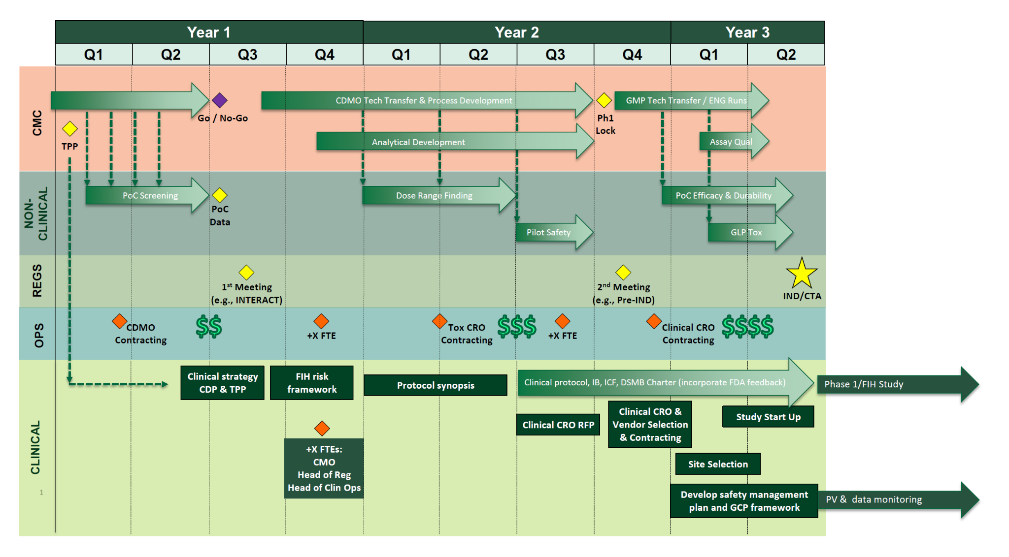 In practice, many clinical leadership roles (e.g., CMO, Head of Clinical Operations, Head of Regulatory) do not need to be filled at program inception and can be phased in as clinical activities scale following key preclinical and CMC milestones. This level of planning is critical for informing insourcing versus outsourcing decisions and for guiding the timing and nature of strategic clinical hires. An important consideration is whether a given capability is readily available through external providers—such as regulatory support, quality and risk management, clinical operations, or supply chain—or whether it represents a highly specialized function that should be internalized to strengthen the company’s competitive advantage.