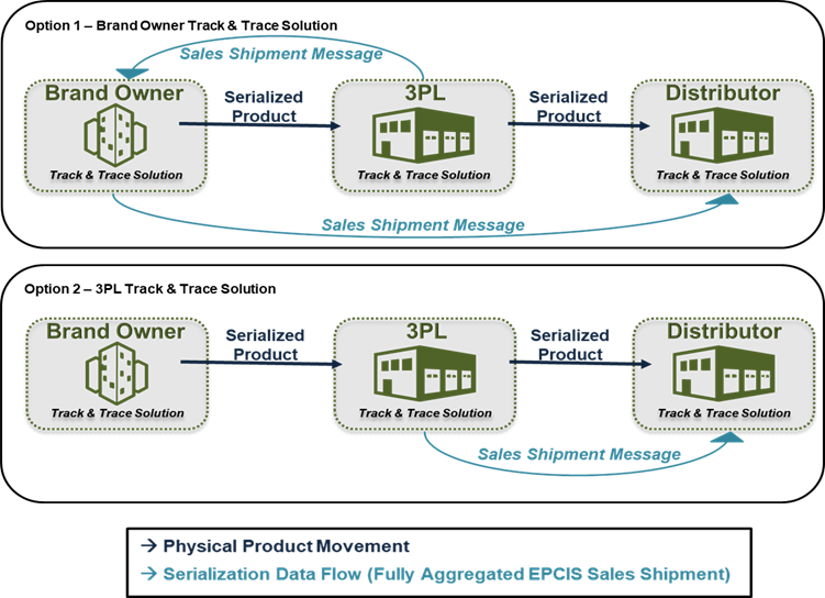 When manufacturers contract with 3PLs for warehousing, logistics, and/or order fulfillment services, the 3PL also performs physical shipment of product to customers. Many 3PLs are establishing capabilities to capture serialization data for shipments during outbound scanning, and depending upon those capabilities, manufacturers may be able to leverage their services to send EPCIS data to distributors.